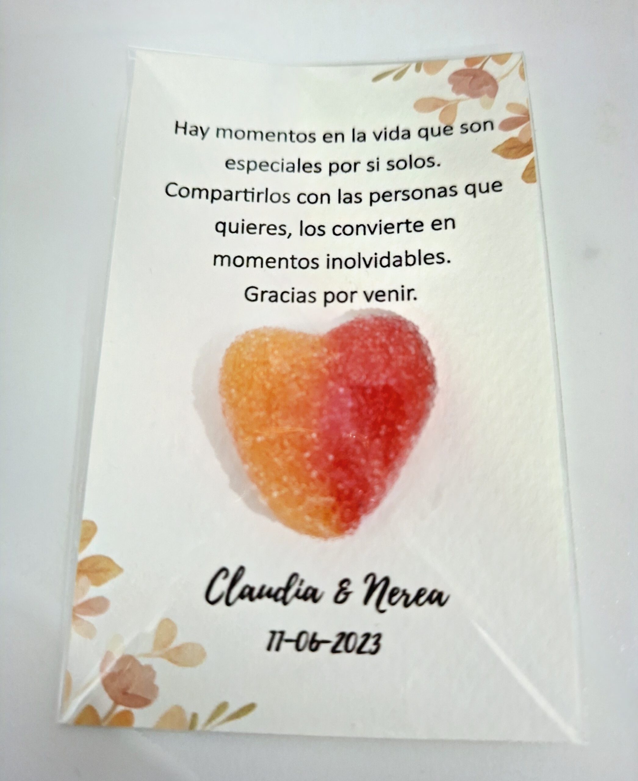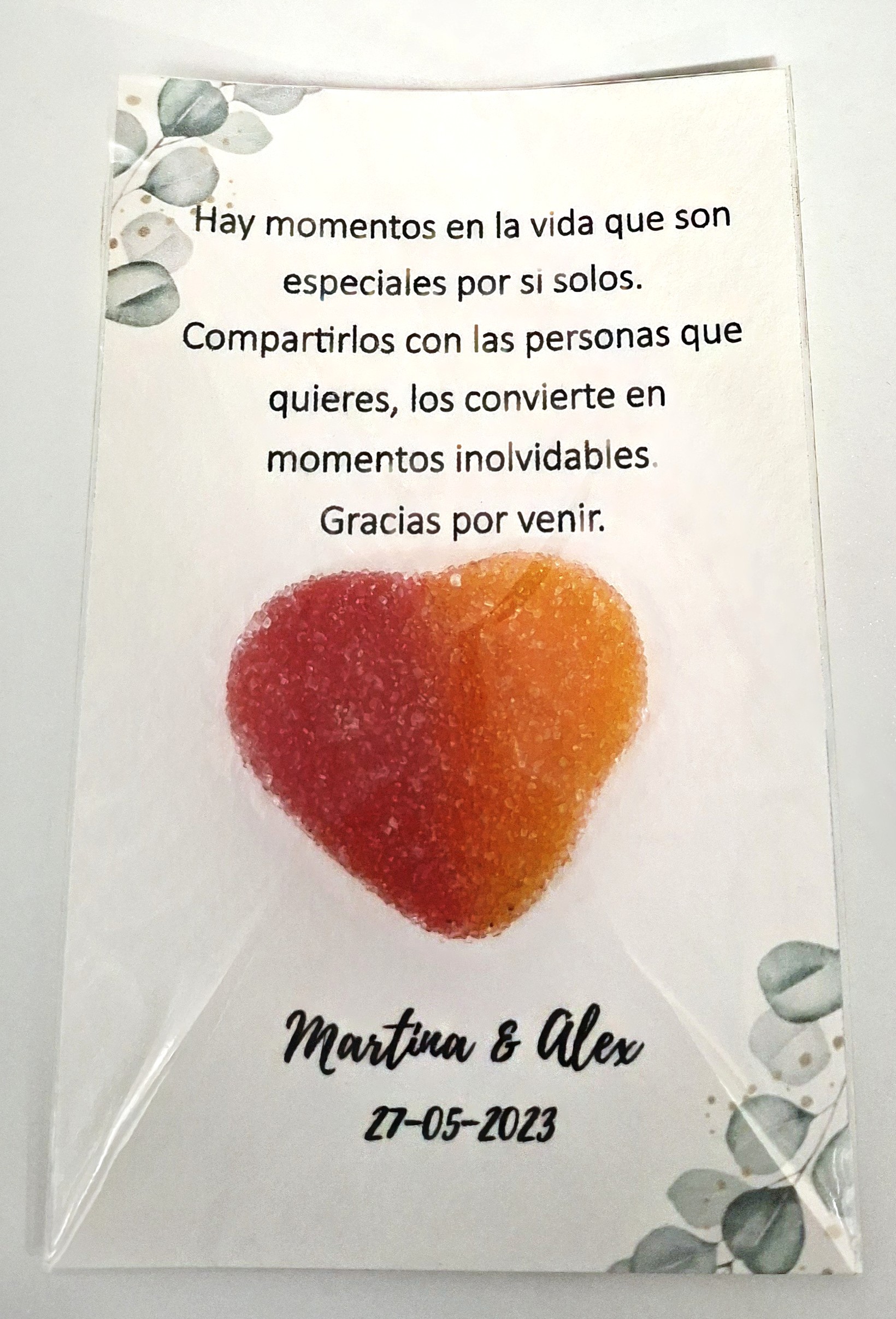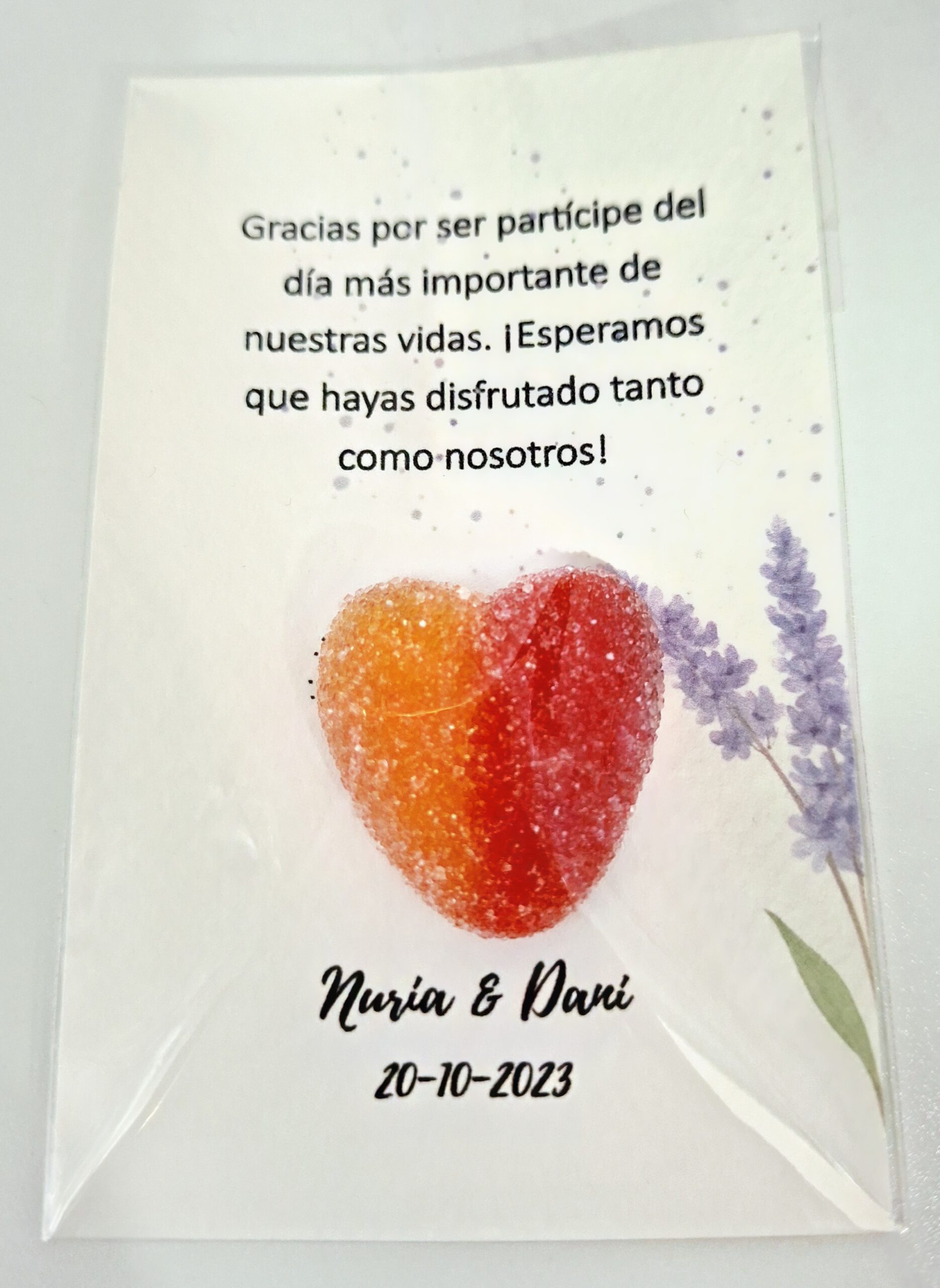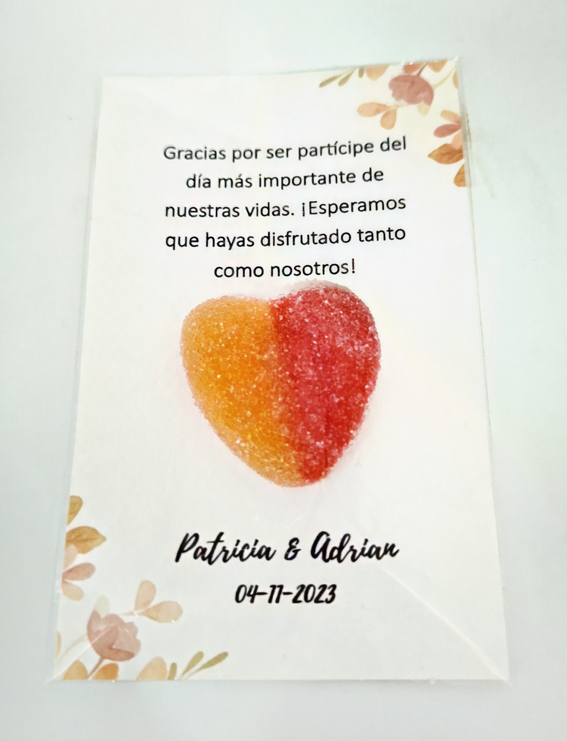 Cada tarjeta es acompañada de una deliciosa chuche en forma de corazón con sabor a melocotón, es un detalle sutil que puede ser adaptado con diferentes temáticas, donde podrás elegir la frase que mas se ajuste a tu gusto, junto con los nombres y fecha del enlace. Una forma diferente y dulce de agradecer la presencia de tus invitados en un día tan especial.