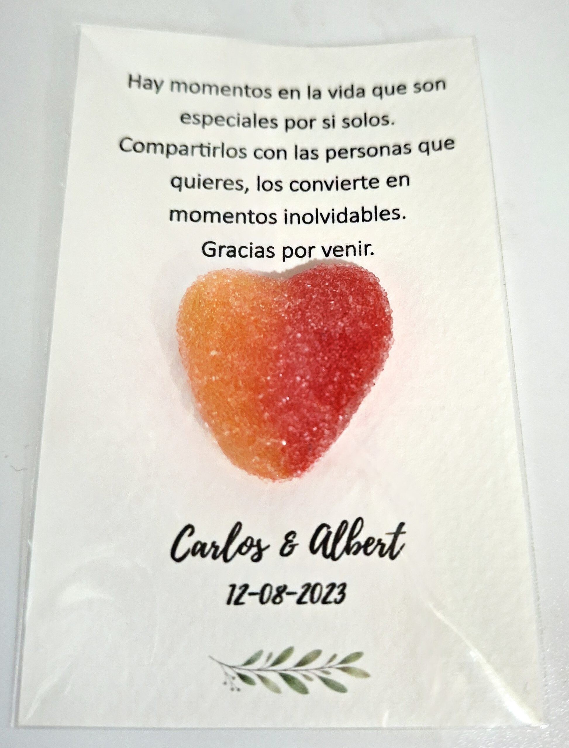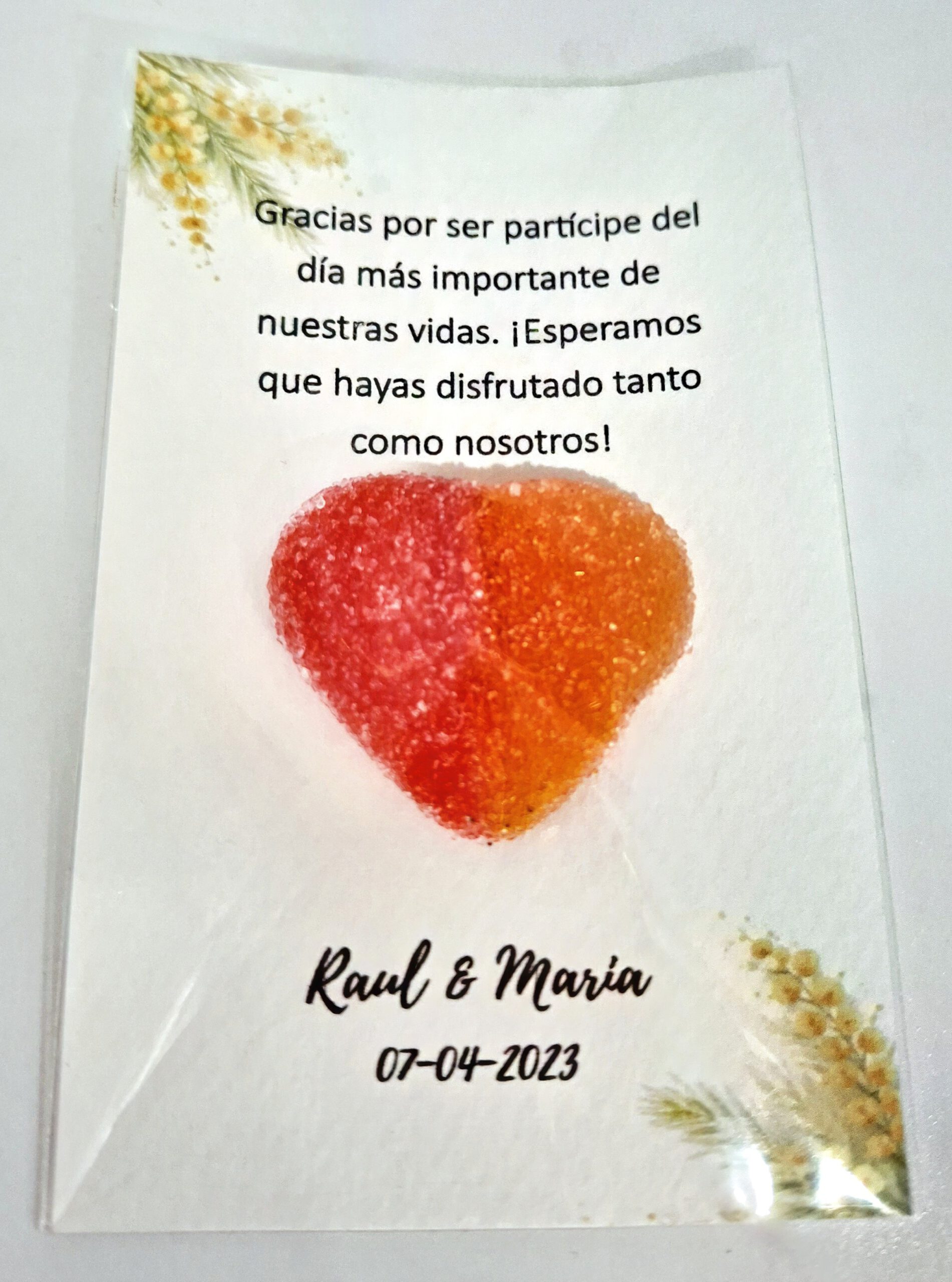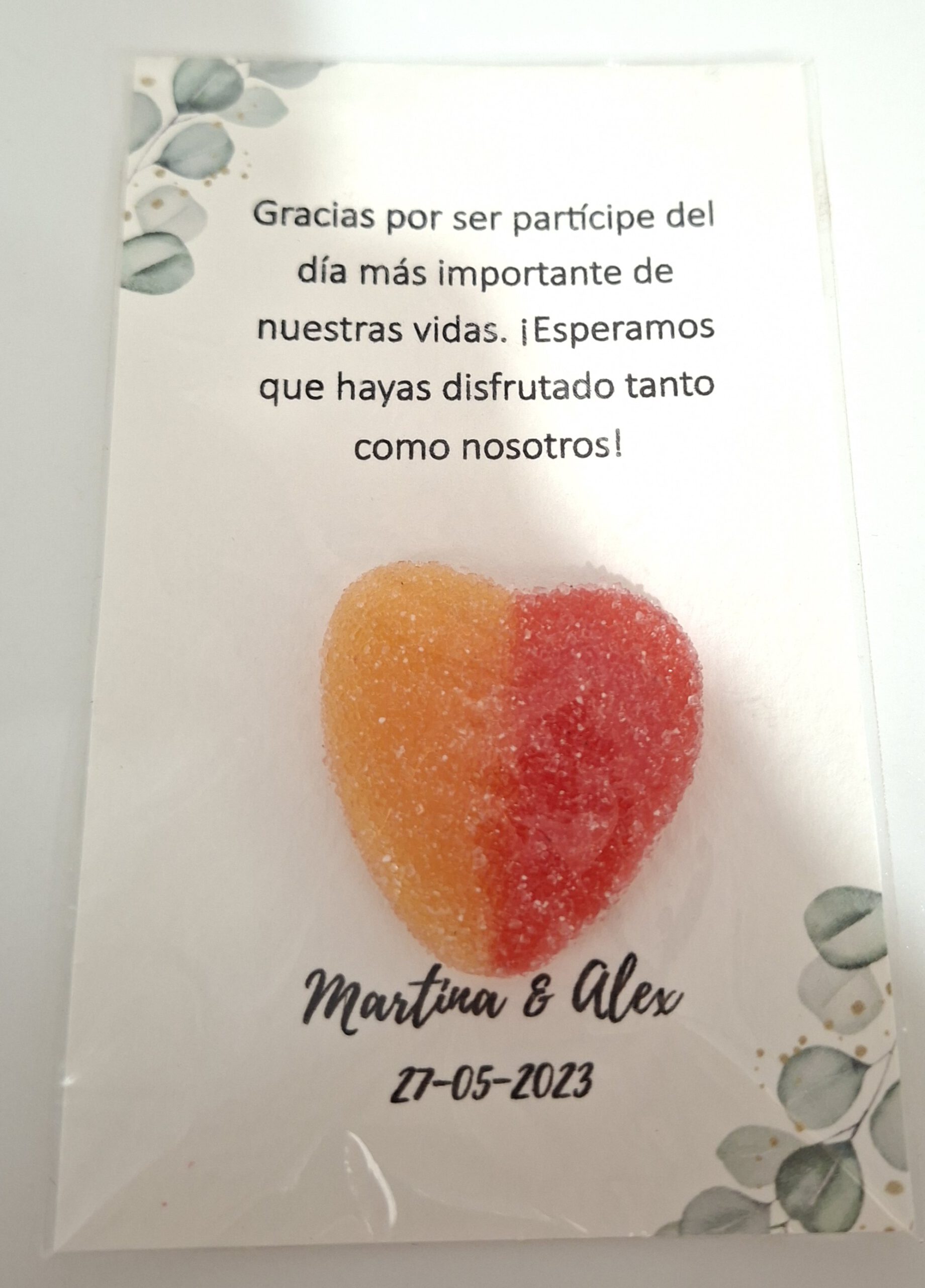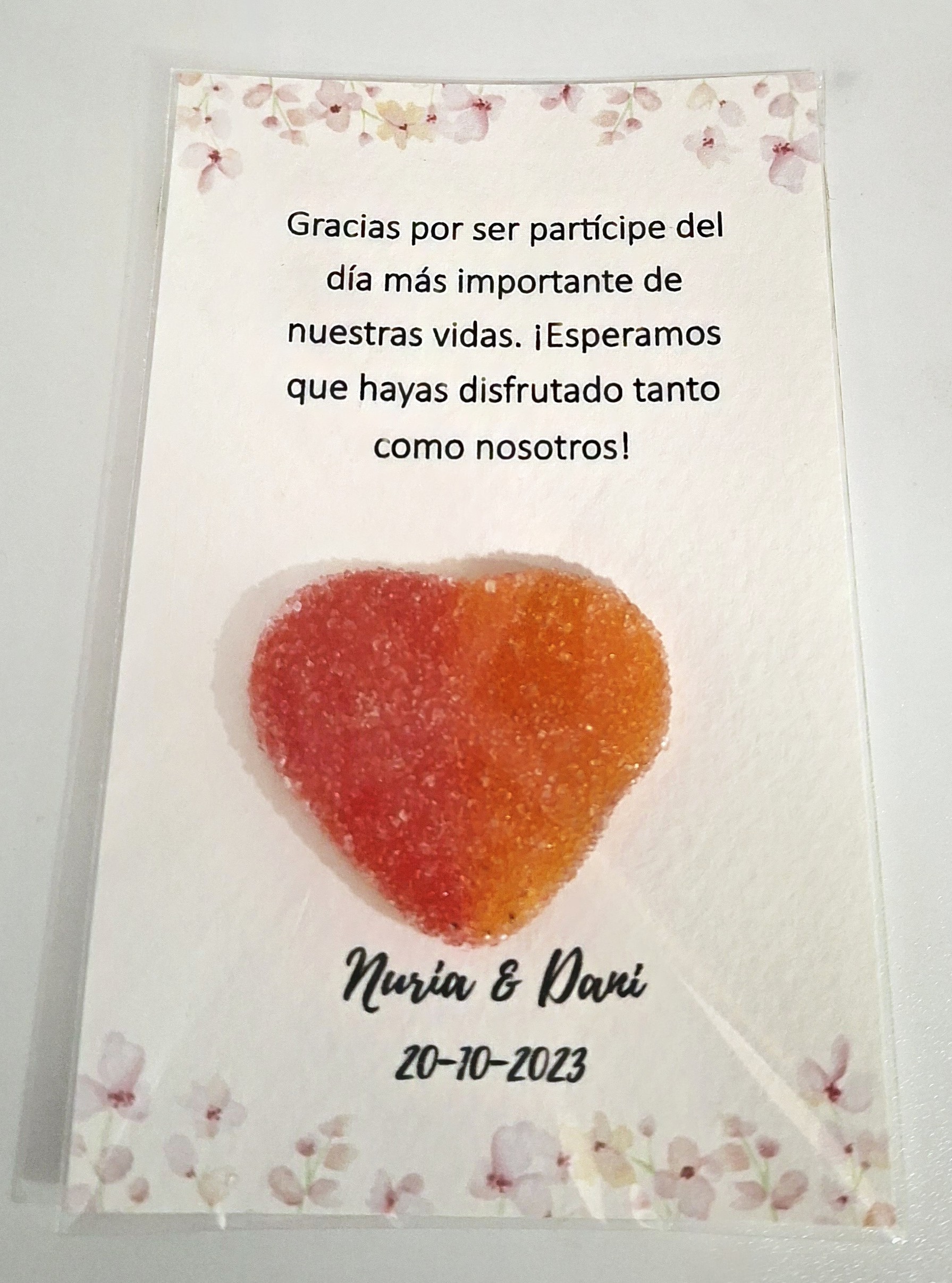 Cada tarjeta es acompañada de una deliciosa chuche en forma de corazón con sabor a melocotón, es un detalle sutil que puede ser adaptado con diferentes temáticas, donde podrás elegir la frase que mas se ajuste a tu gusto, junto con los nombres y fecha del enlace. Una forma diferente y dulce de agradecer la presencia de tus invitados en un día tan especial.