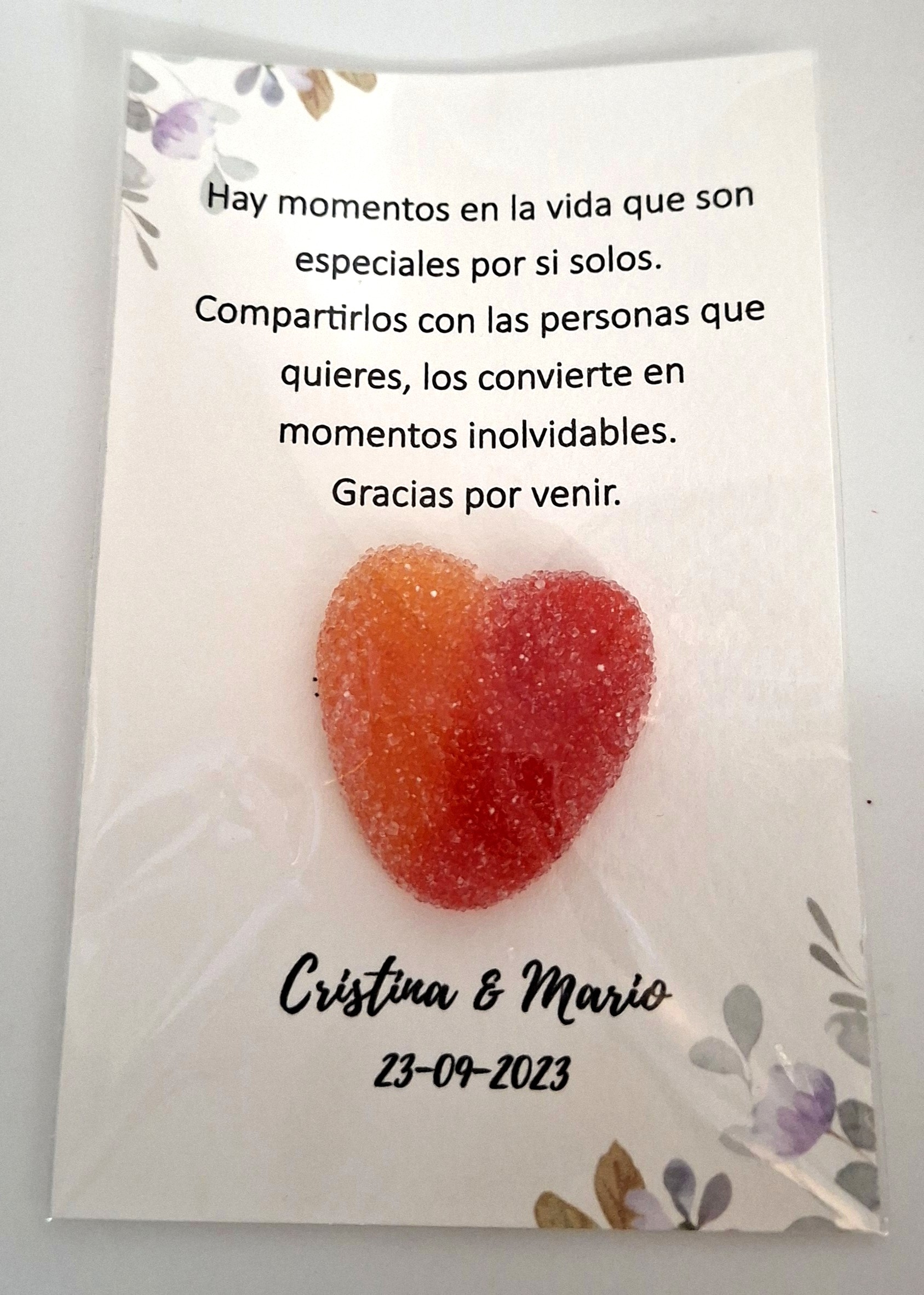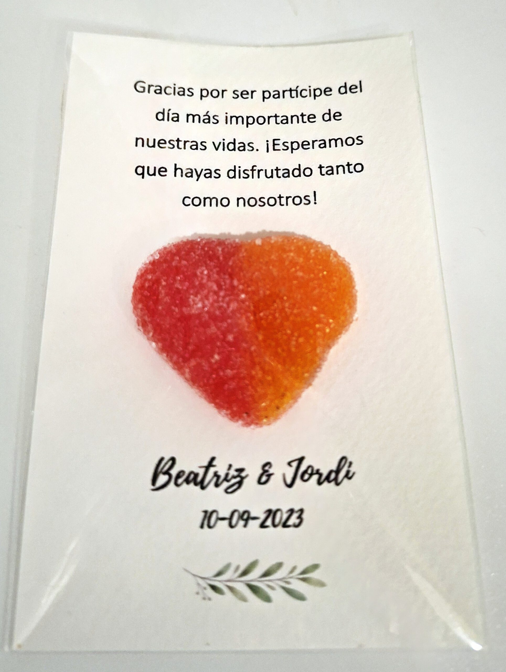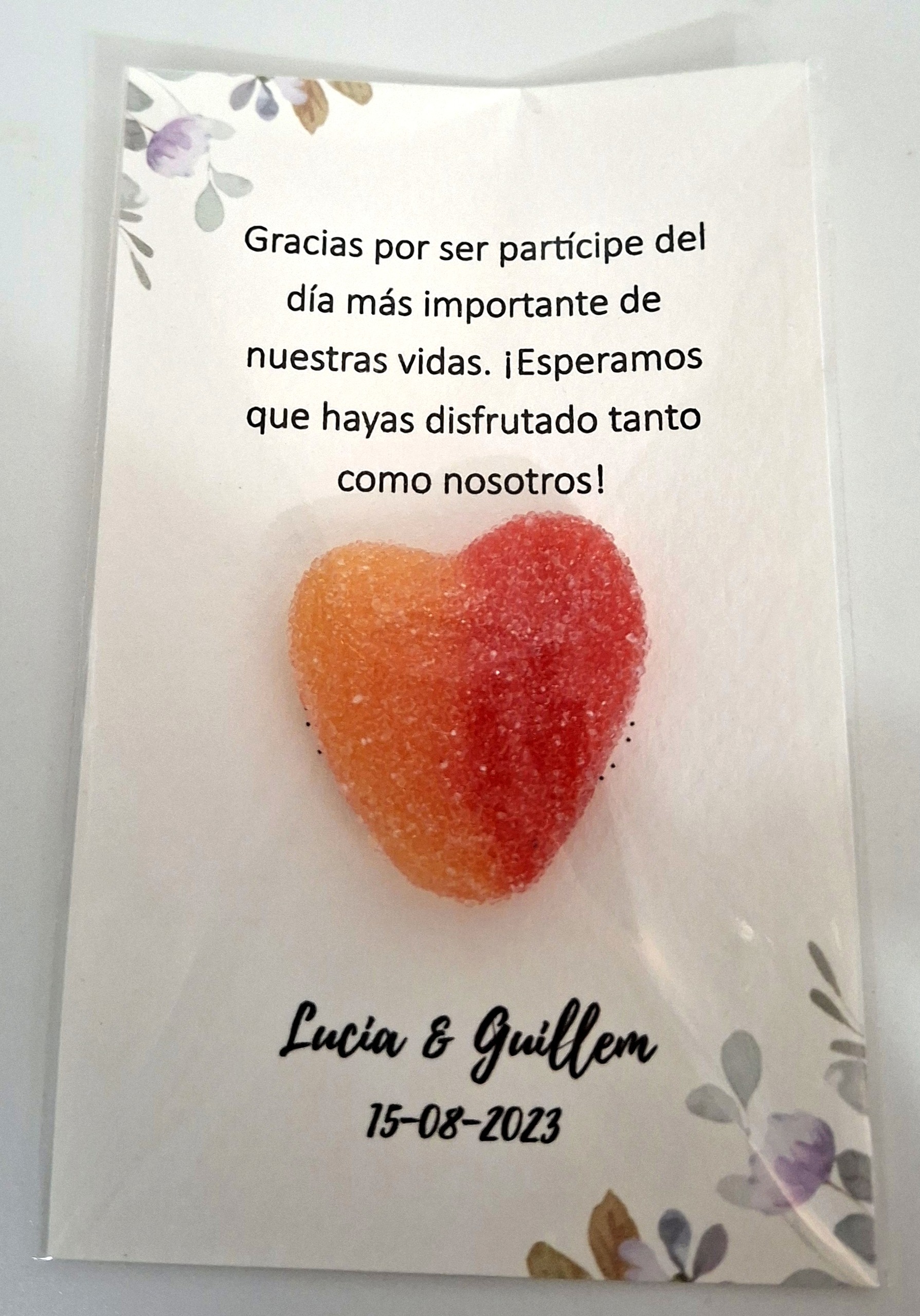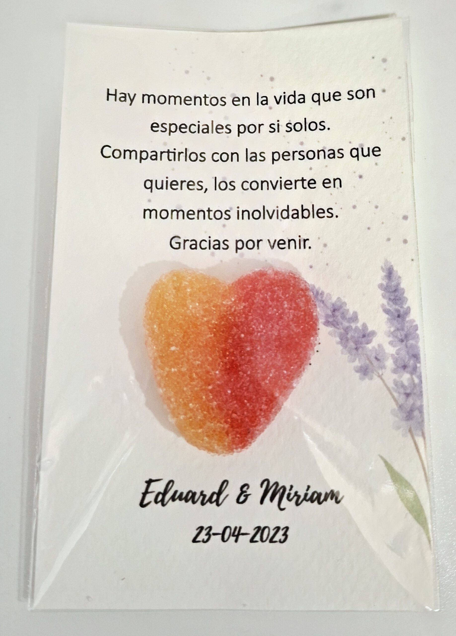 Cada tarjeta es acompañada de una deliciosa chuche en forma de corazón con sabor a melocotón, es un detalle sutil que puede ser adaptado con diferentes temáticas, donde podrás elegir la frase que mas se ajuste a tu gusto, junto con los nombres y fecha del enlace. Una forma diferente y dulce de agradecer la presencia de tus invitados en un día tan especial.