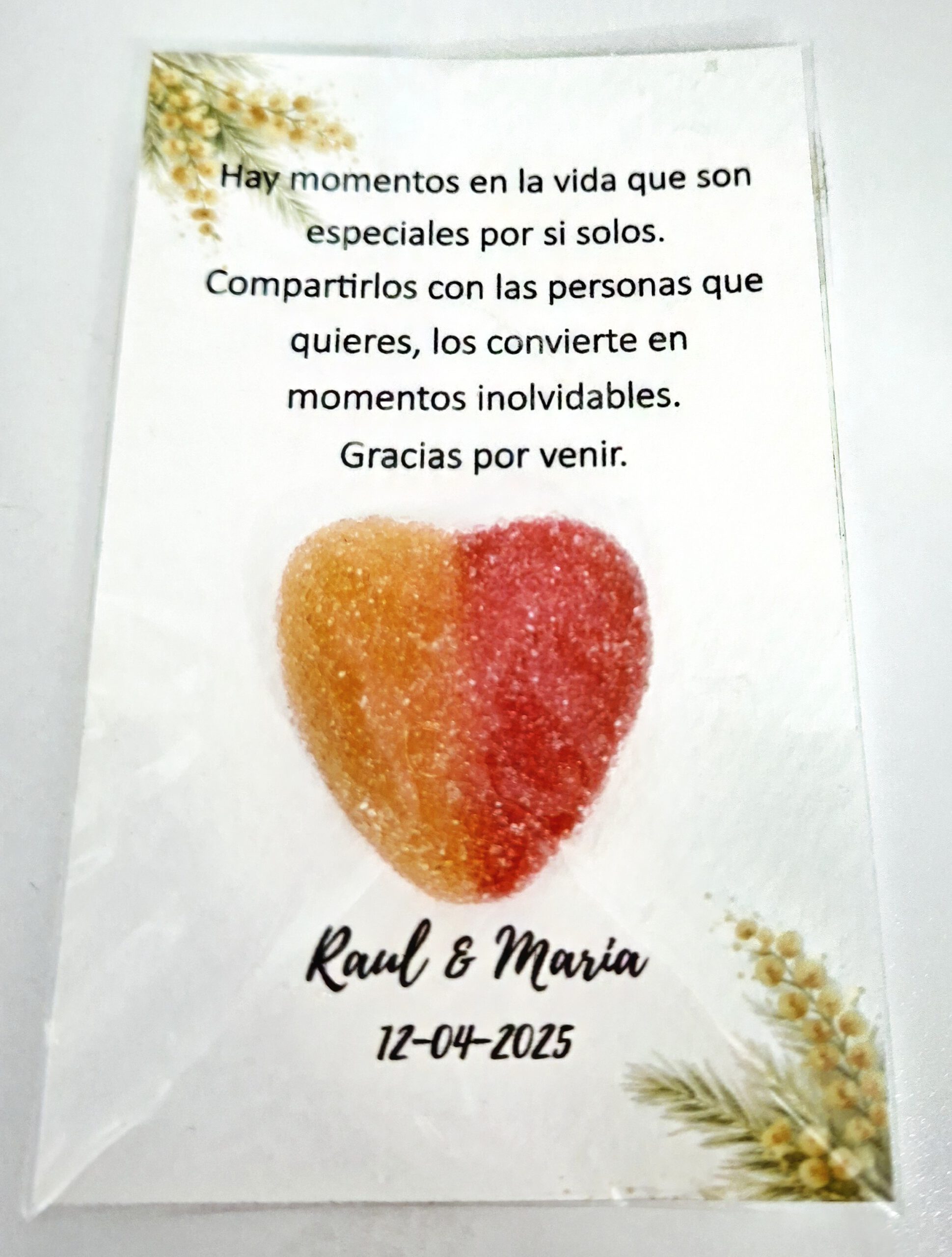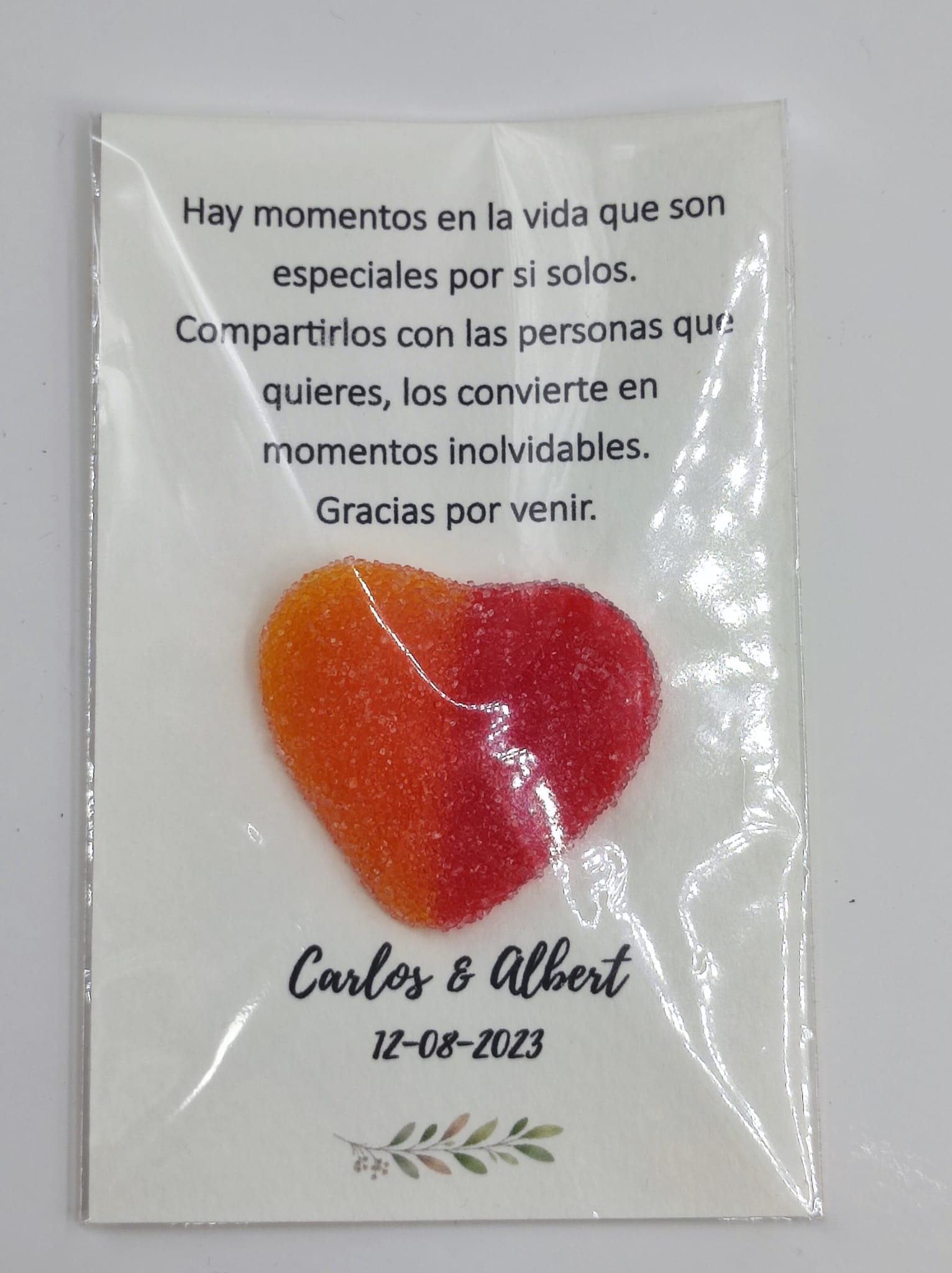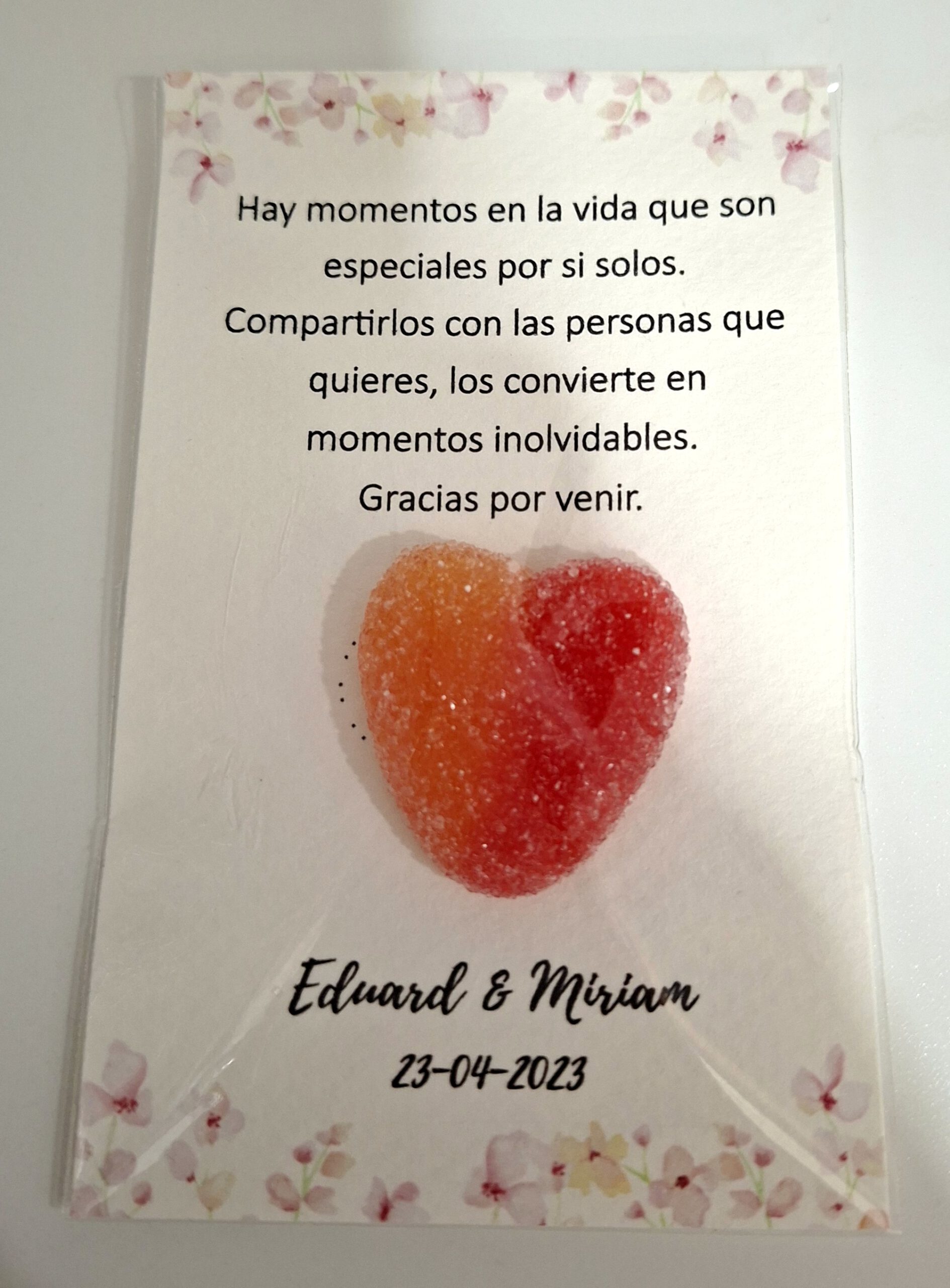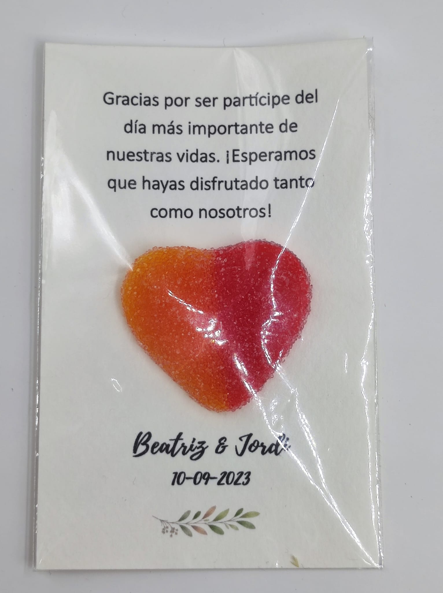Cada tarjeta es acompañada de una deliciosa chuche en forma de corazón con sabor a melocotón, es un detalle sutil que puede ser adaptado con diferentes temáticas, donde podrás elegir la frase que mas se ajuste a tu gusto, junto con los nombres y fecha del enlace. Una forma diferente y dulce de agradecer la presencia de tus invitados en un día tan especial.